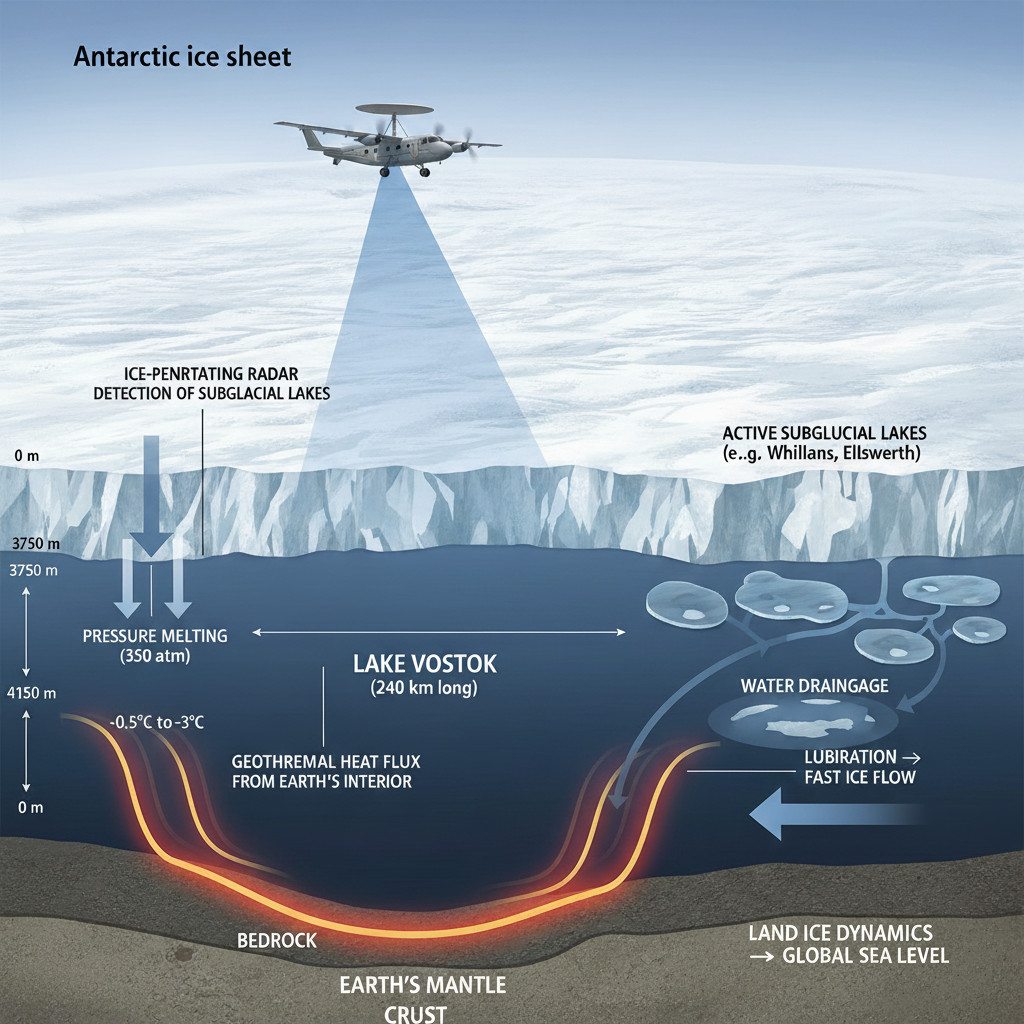 1. Topnienie ciśnieniowe: Ogromna masa lodu wywiera ciśnienie hydrostatyczne (np. około 350 atmosfer przy 3,5 km lodu), które obniża punkt topnienia wody, utrzymując jej temperaturę blisko zera, często w zakresie od −3∘C do −0.5∘C.