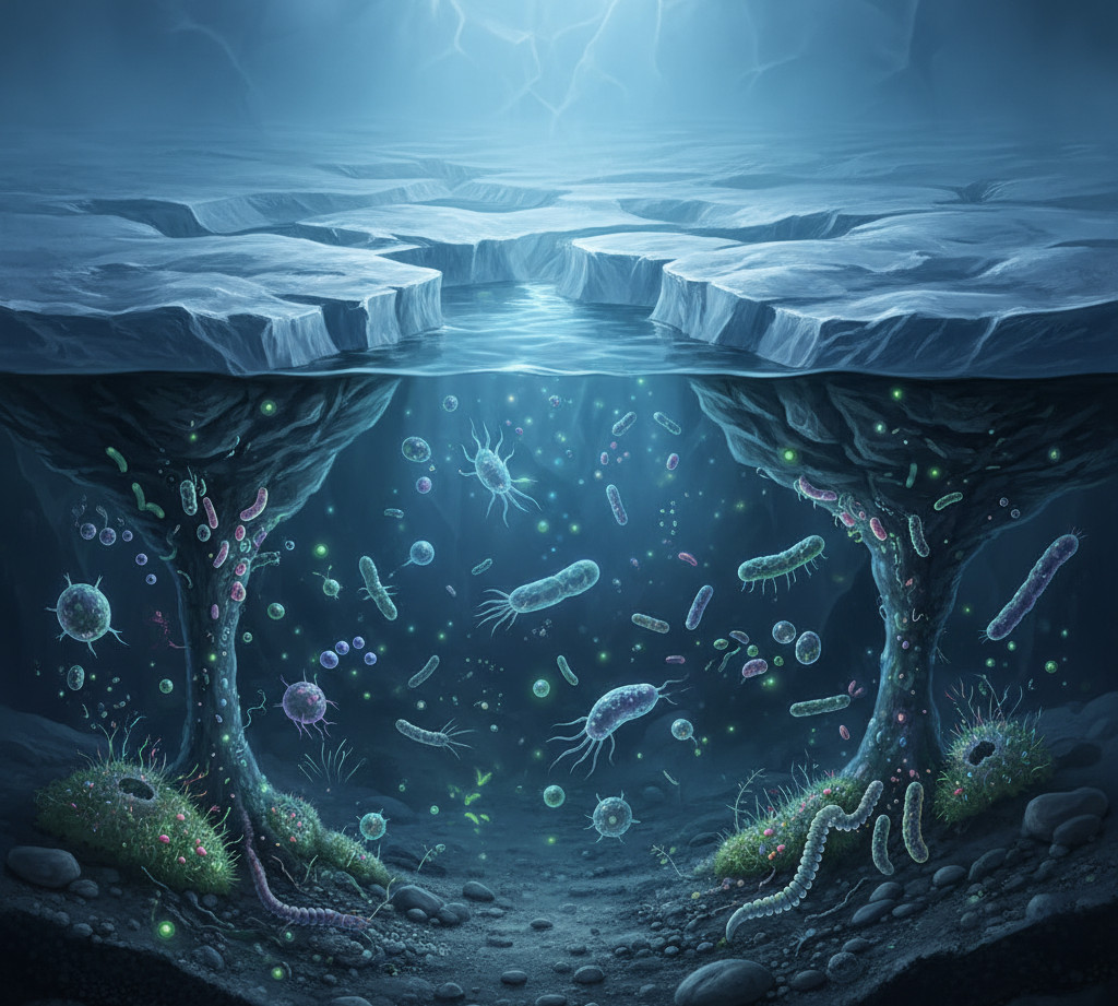 Pionierskie badania ukrytych akwenów Antarktydy udowodniły, że brak światła słonecznego, wysokie ciśnienie i ujemne temperatury nie wykluczają istnienia zróżnicowanych i metabolicznie aktywnych biosfer. Organizmy żyjące w tych warunkach muszą być poliekstremofilami — muszą wykazywać adaptacje do: wysokiego ciśnienia (piezofilność/piezotolerancja), niskiej temperatury (psychrofilność/psychrotolerancja), permanentnej ciemności (zależność od chemosyntezy).