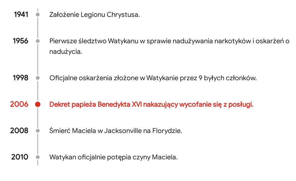 W 1998 roku ośmiu byłych członków zgromadzenia złożyło w Kongregacji Nauki Wiary formalne oskarżenia przeciwko Macielowi, przerywając zmowę milczenia. Machina watykańska zamroziła sprawę na lata. Przełom nastąpił dopiero w 2004 roku, kiedy kardynał Joseph Ratzinger nakazał wznowienie śledztwa. Gdy Ratzinger został papieżem Benedyktem XVI, w maju 2006 roku wydał historyczny dekret nakazujący Macielowi „zrzeczenie się wszelkiej posługi publicznej” i rozpoczęcie „zarezerwowanego życia modlitwy i pokuty”.